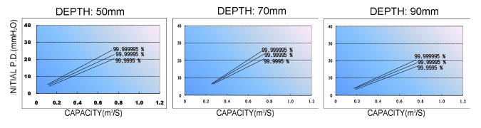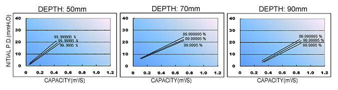 | 305 | 610 | 50/70/90 | 4.8/4.8/8.1 CMM | D 50mm:25.4mm H2O *Face Velocity:0.5m/sec D 70mm:17.0mm H2O *Face Velocity:0.5m/sec D 90mm:25.4mm H2O *Face Velocity:0.85m/sec |