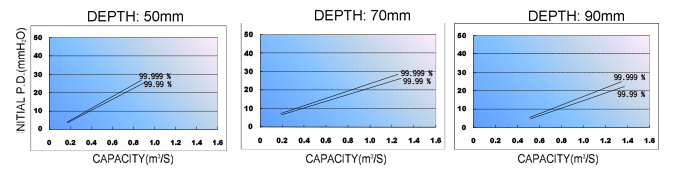 | 570 | 570 | 50/70/90 | 7.6/7.6/9.1 CMM | D 50mm:10.0mm H2O D 70mm:8.0mm H2O D 90mm:8.0mm H2O *Face Velocity:0.55m/sec |
