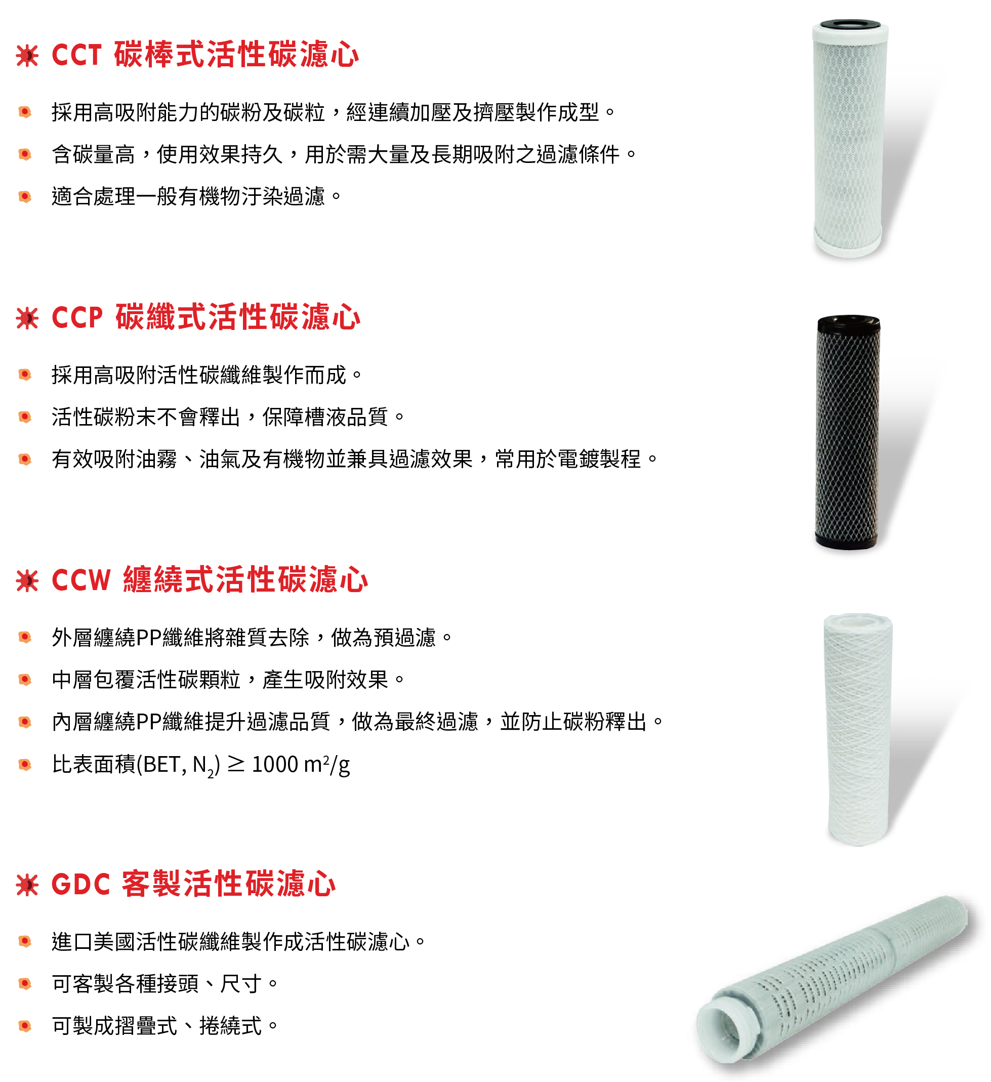 嚴格篩選高品質活性碳,堅持將活性碳經過繁複且多道的前處理,再以 300℃ ~ 500℃ 進行高溫缺氧及熱裂解 碳化,使活性碳形成多孔性的碳結構體,最後將活性碳篩選,進行 800℃ ~ 1100℃的高溫活化,以清除堆積在 孔隙內的反應生成物,提高碳顆粒的孔洞面積,提升濾芯的吸附能力。