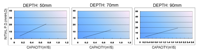 | 305 | 610 | 50/70/90 | 4.8/8.1/11.5 CMM | D 50mm:12.5mm H2O *Face Velocity:0.65m/sec D 70mm:12.5mm H2O *Face Velocity:0.85m/sec D 90mm:12.5mm H2O *Face Velocity速:1.25m/sec |