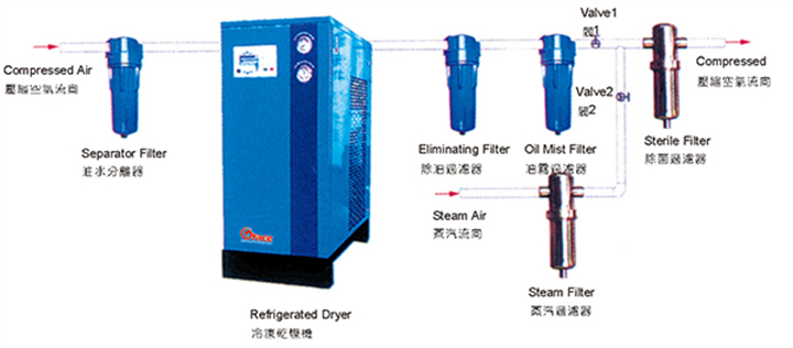 Manual drain eliminates water regularly, and steamed by-pass valve is disposition for selection.